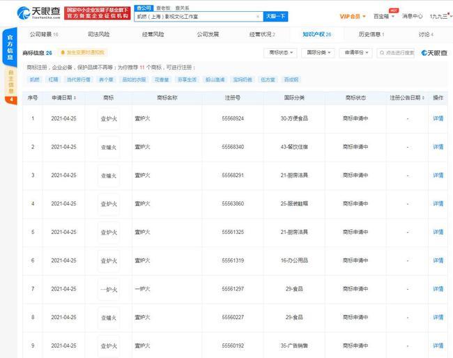 近日,凯燃(上海)影视文化工作室申请注册多个“壹炉火”“一炉火”商标,国际分类涉及食品、餐饮住宿、酒等,商标状态多为“商标申请中”。