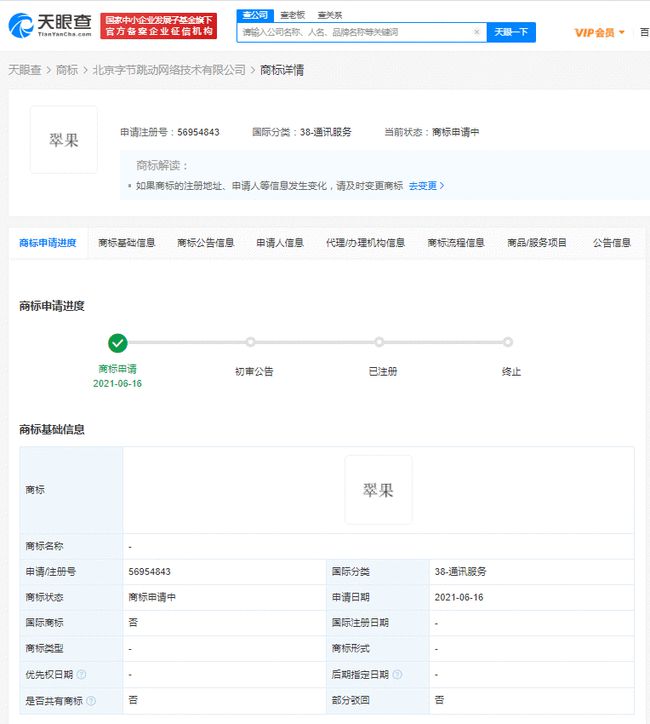 字节跳动申请注册“翠果”“脆果”商标,商标状态为申请中