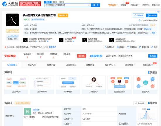 据天眼查 App 显示,该公司成立于 2020 年 12 月 15 日,法定代表人何世杰,注册资本 5 万元人民币,经营范围包括广播电视节目制作经营;电子出版物制作;音像制品制作;演出经纪;网络文化经营;电影发行;信息网络传播视听节目等。