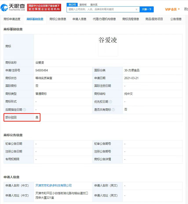天眼查App显示,“谷爱凌”商标申请信息达29条。其中,自然人张某于2019年6月申请的11个“谷爱凌”商标已完成注册,国际分类涉及教育教育娱乐、广告销售、灯具空调等。其余多个公司及自然人申请的“谷爱凌”商标流程显示为“被驳回”或“商标无效”。