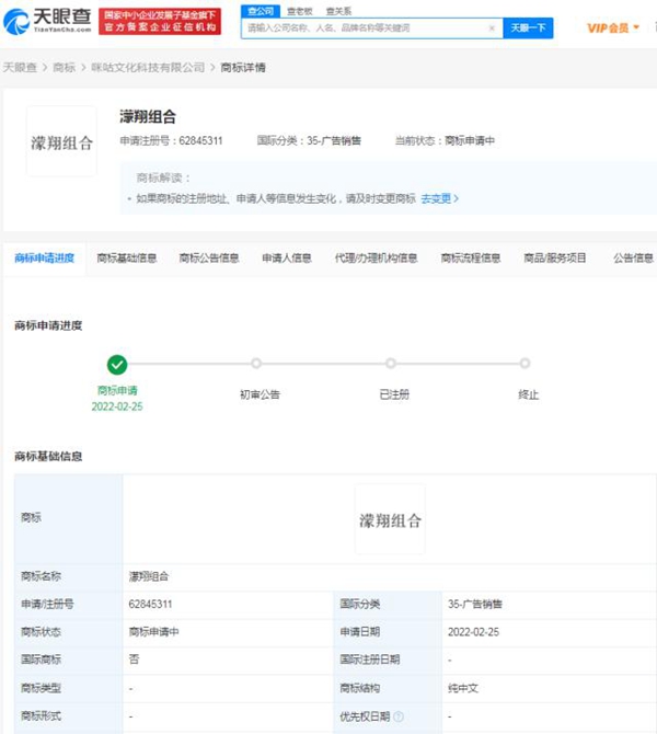 天眼查App显示,近日,中国移动旗下咪咕文化科技有限公司申请注册多个“濛翔组合”“濛翔”“濛翔成真”商标,国际分类涉及广告销售、教育娱乐、健身器材等,当前商标状态均为申请中。