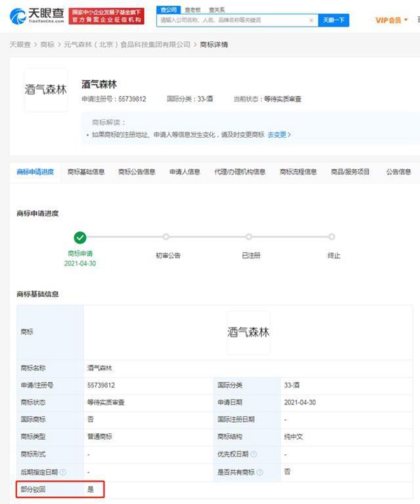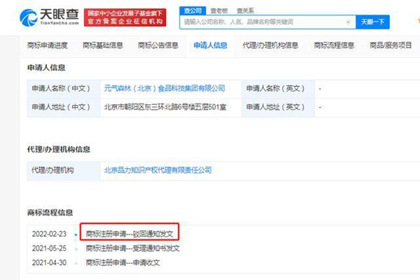 近日,元气森林(北京)食品科技集团有限公司申请注册的“酒气森林”商标,流程状态变更为“驳回通知发文”,国际分类包括酒、啤酒饮料、餐饮住宿,以上商标均申请注册于2021年4月。