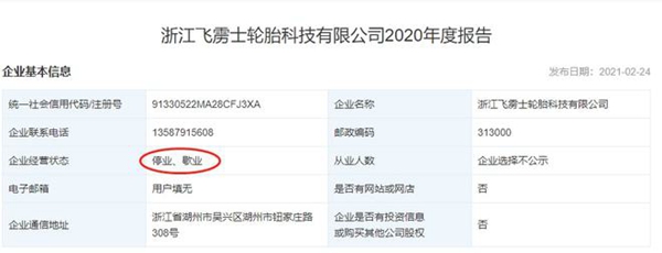 根据调查,飞雳士轮胎早在2020年就已经处于关门歇业的状态。在公司2020年的年报中,经营状态栏里赫然显示“停业”。