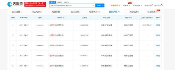 天眼查App显示,近期,北京交个朋友数码科技有限公司申请注册的“老罗和他的朋友们”商标状态变更为“已注册”,国际分类包括通讯服务、广告销售、科学仪器等,商标均申请于2021年4月。