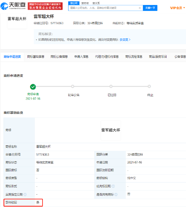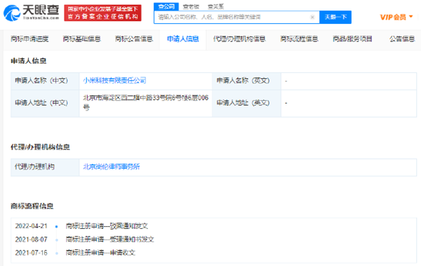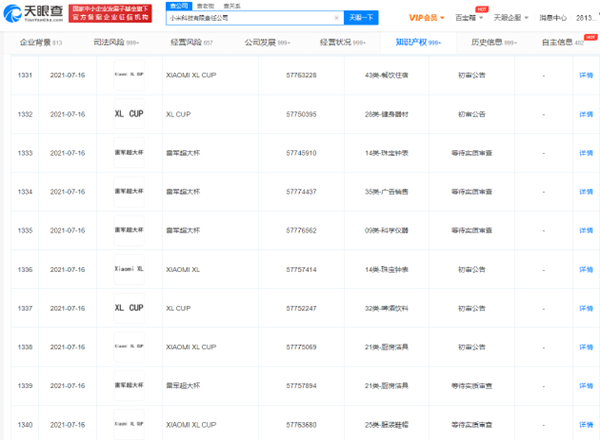 天眼查App显示,近期,小米科技有限责任公司申请的多个“雷军超大杯”商标流程变更为“驳回通知发文”,这些商标均申请于2021年7月,国际分类含广告销售、啤酒饮料、食品等。不过,该公司申请的多个“XIAOMI XL”“XL CUP”“XIAOMI XL CUP”商标状态已变更为“初审公告”。