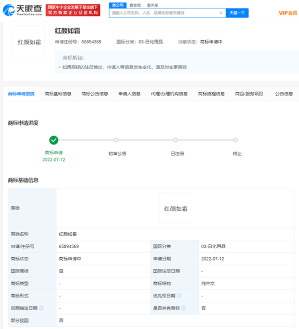 趁着这首歌的热度,天眼查App显示,7月12日,“红颜如霜”商标被自然人朱某申请注册,国际分类为日化用品,当前商标进度为申请中。此外,目前已有两家名称含“红颜如霜”的个体工商户注册成立,成立日期分别为7月15日、7月19日。