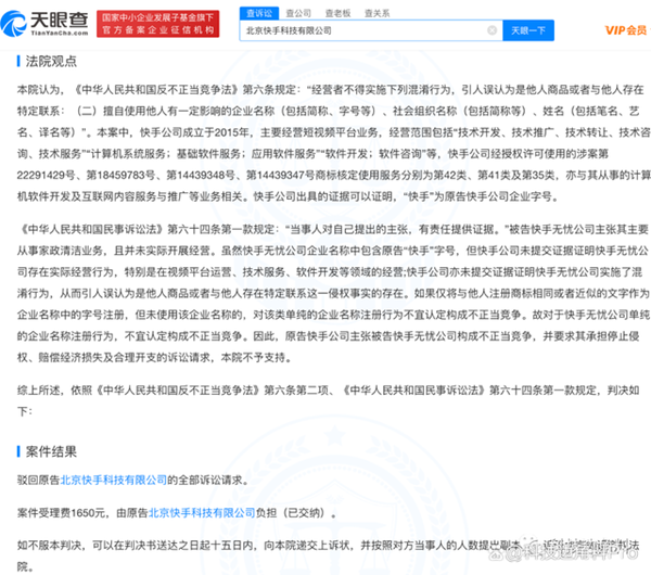 丰台区人民法院审理认为快手家政公司企业名称中包含原告“快手”字号,但快手公司未提交证据证明快手无忧公司存在实际经营行为,特别是在视频平台运营、技术服务、软件开发等领域的经营;快手公司亦未提交证据证明快手无忧公司实施了混淆行为,从而引人误认为是他人商品或者与他人存在特定联系这一侵权事实的存在,不宜认定构成不正当竞争,据此驳回快手公司所有诉讼请求。