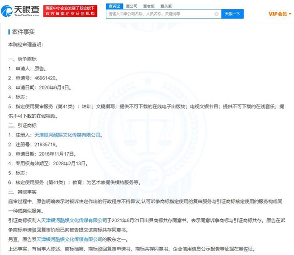 文书显示,国家知识产权局曾做出关于第46961420号“酷头条”商标驳回复审决定。优酷公司诉称,其与引证商标“酷娱头条”权利人天津银河酷娱文化传媒有限公司具有关联关系,已与其达成商标共存协议;诉争商标与引证商标在文字构成、含义、指向等方面存在较大差异,不构成近似,故请求法院撤销被诉决定,判令国家知识产权局重新作出决定。