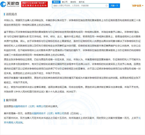 优酷诉争酷头条商标被驳回与酷娱头条构成近似