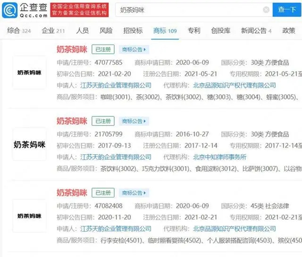 近日,刘强东公开向奶茶妹妹章泽天致歉,并宣布与妻子即将迎来二胎。企查查APP显示,章泽天100%持股的江苏天韵企业管理有限公司申请注册的多枚“奶茶宝宝”商标已获批,国际分类涉及方便食品、广告销售、教育娱乐等,商标状态均为“已注册”。此外,该公司注册的多枚“奶茶妈咪”商标也已注册成功。
