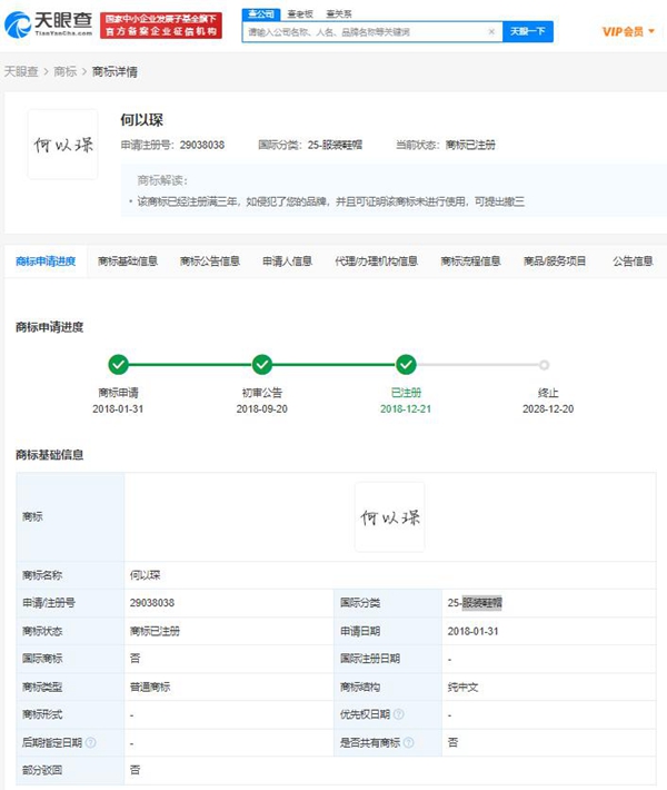 天眼查App显示,“何以琛”商标已被深圳一实业公司及自然人高某成功注册,这两枚商标分别申请于2021年12月、2018年1月,国际分类为餐饮住宿、服装鞋帽。