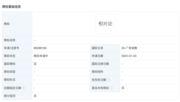 天眼查APP显示,近日,宁德时代申请注册商标“相对论”,国际分类为建筑修理、广告销售,当前商标状态为注册申请中。