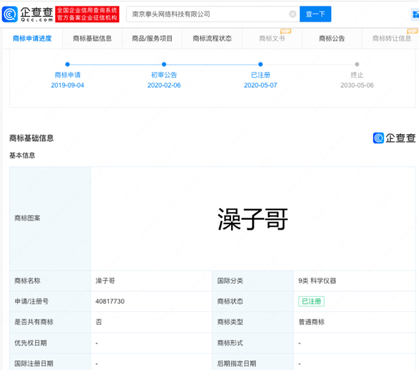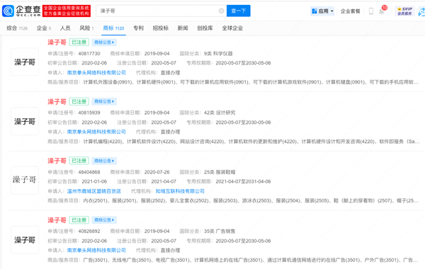 企查查APP显示,“澡子哥”已被申请注册成商标,申请人多为南京拳头网络科技有限公司,商标分类包含科学仪器、设计研究、广告销售等。