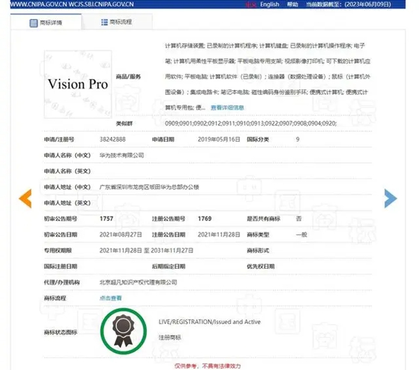 报道指出,中国商标网的查询结果显示,华为公司早在 2019 年 5 月 16 日就成功申请了 Vision Pro 的商标,而且该商标的专用权期限长达 10 年,为 2021 年 11 月 28 日至 2031 年 11 月 27 日。该商标属于国际分类 9,涵盖了液晶电视、头戴式虚拟现实装置、无线电设备等多种商品和服务项目。
