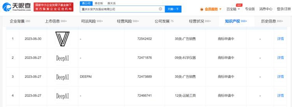 据天眼查 App 显示,近日,长安汽车 ( 000625 ) 申请注册 3 枚 "Deep AI" 商标,国际分类涉及科学仪器、运输工具、广告销售,当前商标状态均为申请中。