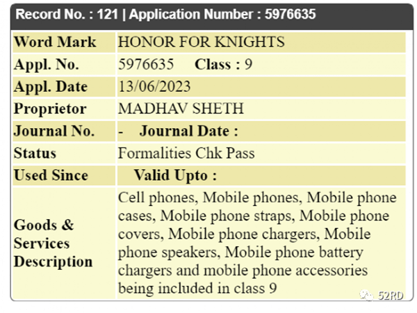 近日,据印度媒体Fonearena息,荣耀在印度申请了一个名为“Honor for Knights”的新商标,申请人为传言将担任荣耀印度品牌CEO的前realme印度CEO Madhav Sheth,该商标申请号为5976635,申请时间为6月13日,属于第9类商标,范围覆盖手机和手机配件(手机挂绳、手机壳、手机充电器等)。