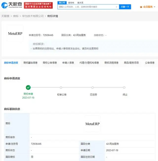 天眼查App显示,近日,华为技术有限公司申请注册“MetaERP”商标,国际分类为网站服务,当前商标状态为申请中。