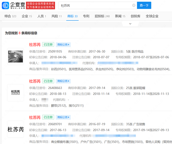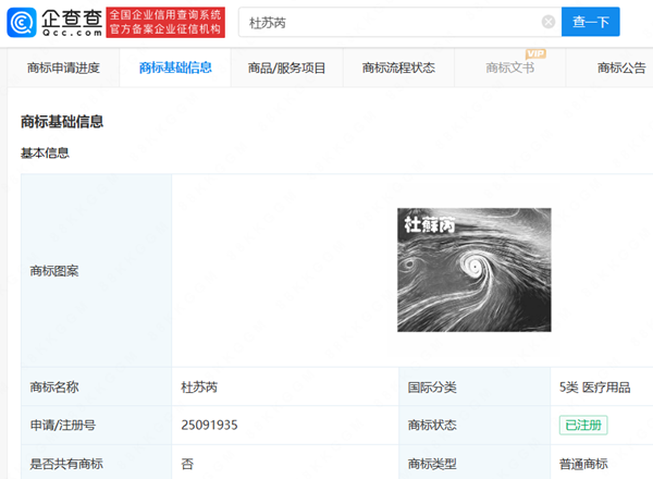 企查查APP显示,“杜苏芮”已被多个公司和自然人注册商标,国际分类涉及医疗用品、服装鞋帽、广告销售等,当前商标状态均为注册成功。此外,台风“莫兰蒂”“威马逊”等均被申请注册商标,当前商标状态多为已注册。