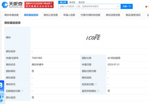 天眼查App显示,近日,宁德时代(300750)申请注册“COFE”和“i COFE”商标,国际分类分别为建筑修理、网站服务,当前商标状态均为申请中。