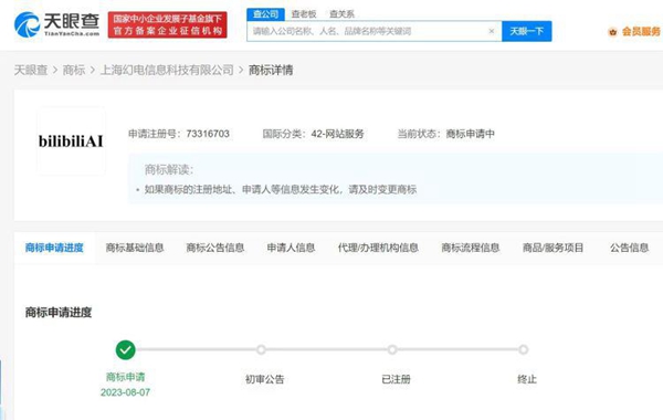 据天眼查 App 显示,近日,B 站关联公司上海幻电信息科技有限公司申请注册 "bilibiliAI" 商标,国际分类为网站服务,当前商标状态为申请中。