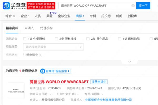企查查 APP 显示,近日,暴雪娱乐有限公司申请注册一枚 " 魔兽世界 WORLD OF WARCRAFT" 商标,国际分类为设计研究。
